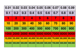 To use the chart, simply place counters on the square of the number that you wish to make. For example, if I wanted to make the number 5.31, I would place a counter on 5, a counter on 0.3 and a counter on 0.01. It is here we see that the chart supports the mathematical skill of partitioning numbers.