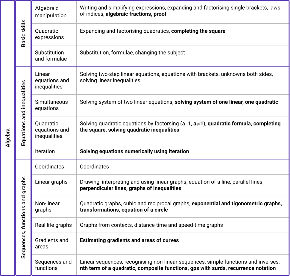 - Other key topics include simultaneous equations, including non-linear, expanding triple brackets, solutions of equations using iteration, gradients and areas, particularly using speed-time and distance-time graphs.