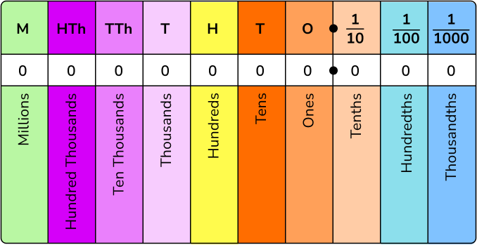 Place value charts have letters on them to represent each position Millions, Hundred Thousands, Ten Thousands, Thousands, Hundreds, Tens, Ones, tenths, hundredths, and so on.