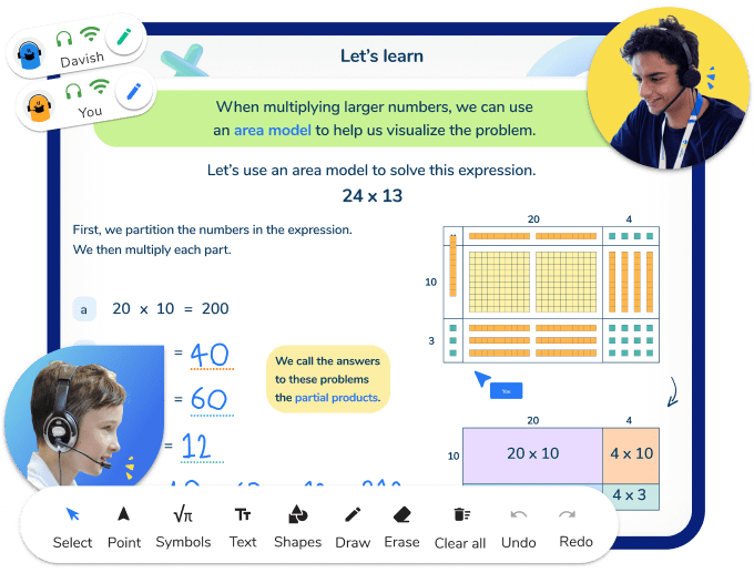 Schools pick a schedule for their AI math tutoring ensuring students have regular opportunities to focus and learn. On-demand AI tutoring sessions are also available outside of this schedule, either at school or for homework. The AI tutor does not generate lessons but instead works through a structured curriculum of teacher-developed lesson plans. The lessons the AI tutor covers is determined by the program chosen by each student’s teacher or school. The AI tutor speaks to students out loud, providing explanations and listening to students as they respond. The AI tutor adapts instruction to suit each student, just like a traditional tutor. The AI models key tutoring strategies for effective online math instruction such as motivation, relating to interests, modelling, waiting, rephrasing, scaffolding, affirming relationships, and encouraging verbal reasoning.
