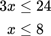 \begin{aligned} 3x&\leq24\\ x&\leq8 \end{aligned}