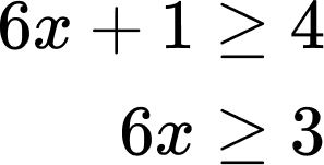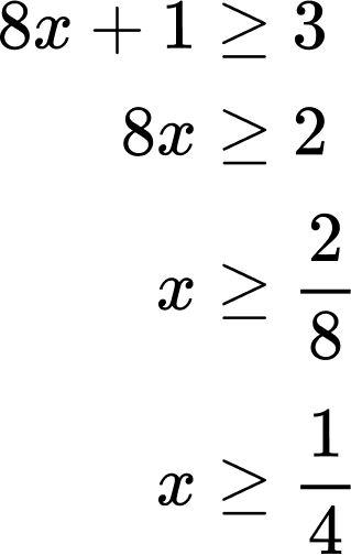 \begin{aligned} 8x+1&\geq3\\ 8x&\geq2\\ x&\geq\cfrac{2}{8}\\ x&\geq\cfrac{1}{4} \end{aligned}