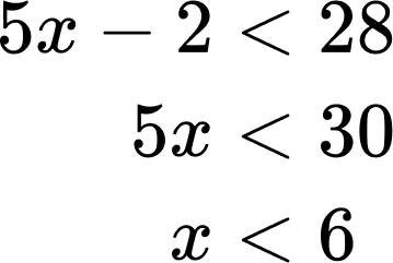 \begin{aligned} 5x-2&<28\\ 5x&<30\\ x&<6 \end{aligned}