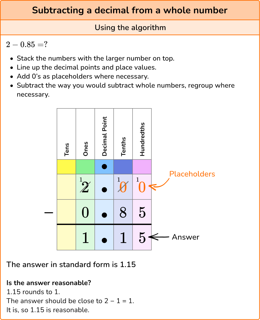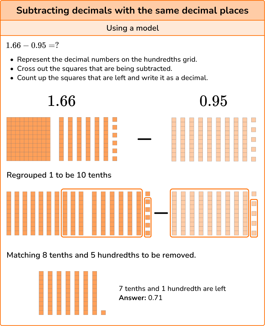 Rounding decimals Place valueHere you will learn about subtracting decimals, including how to subtract decimals and solve problems that involve the subtraction of decimal numbers.