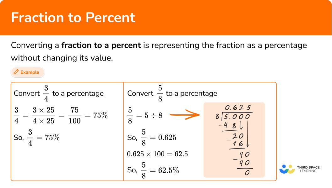 Percent Percent of a number Multiplication and division Simplifying fractions Mixed number to improper fraction Equivalent fractionsHere you will learn about converting fractions to percentages.