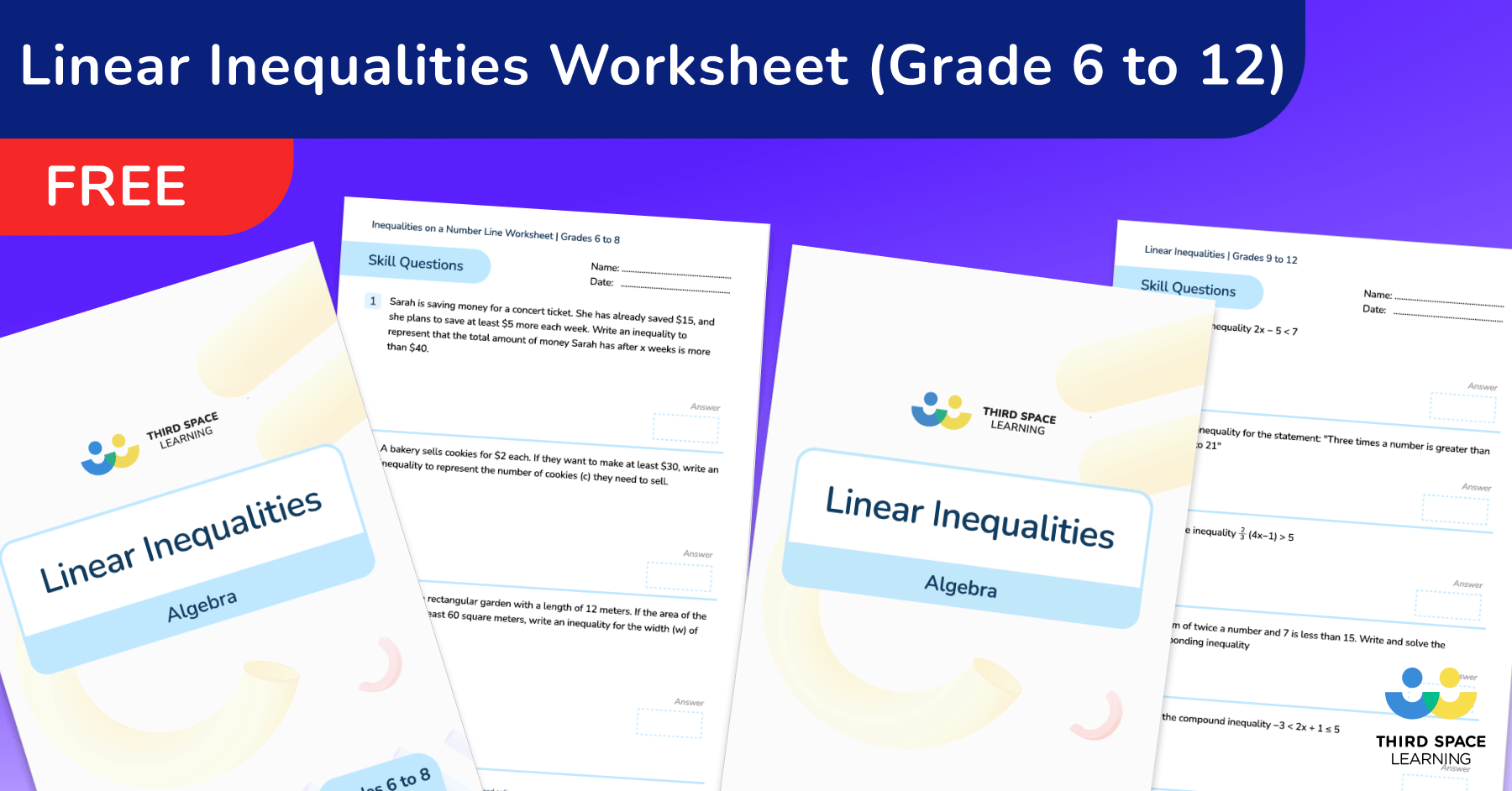 Free Linear Inequalities worksheets for 7th Grade and High School. Each worksheet contains 10 skills based practice questions and 5 applied questions.