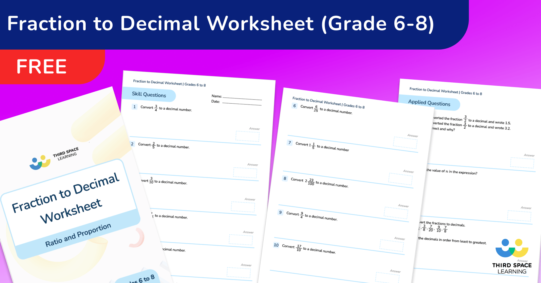 Free Fraction To Decimal worksheet for 7th Grade with 10 skills based practice questions and 5 applied questions.