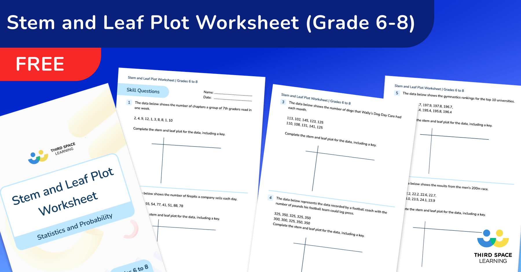 Free stem and leaf plot worksheet for 7th Grade with 10 skills based practice questions and 5 applied questions.