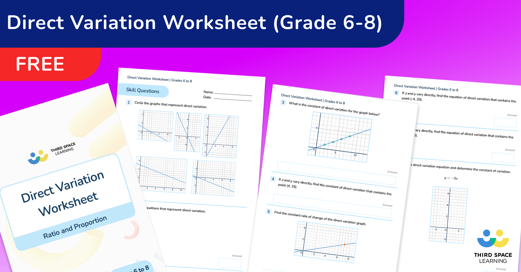 Free Direct Variation worksheet for 7th Grade and 8th Grade with 10 skills based practice questions and 5 applied questions.