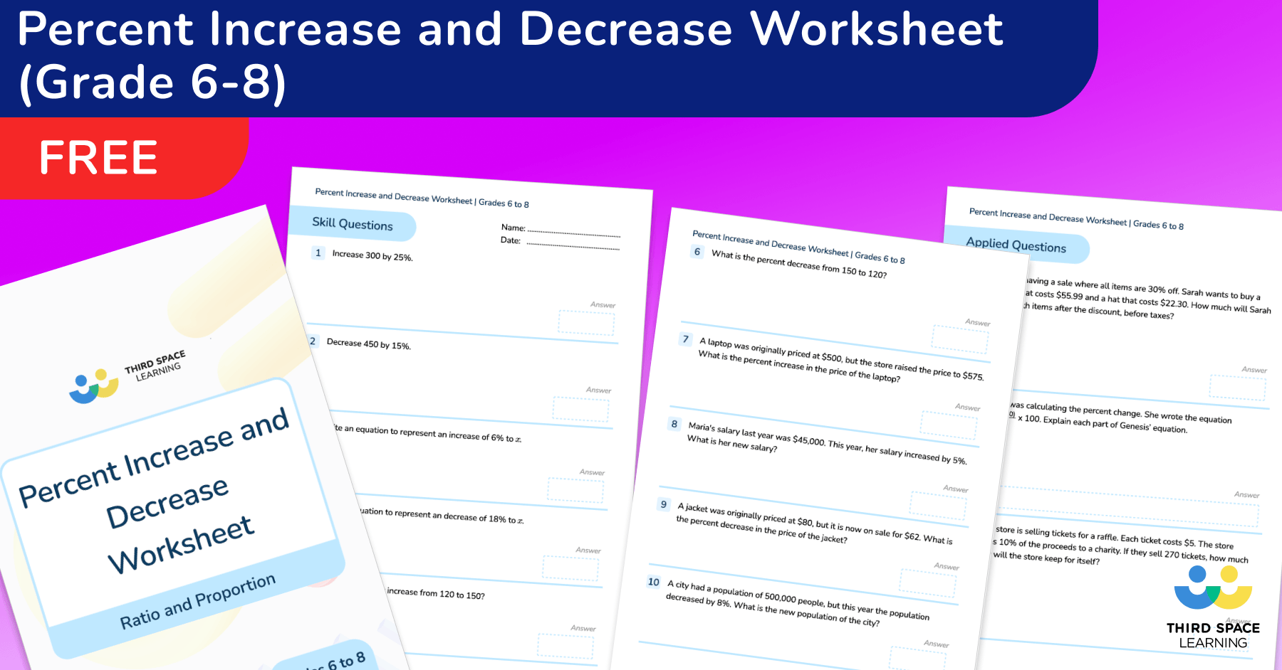 Free Percent Increase And Decrease worksheet for 7th Grade with 10 skills based practice questions and 5 applied questions.