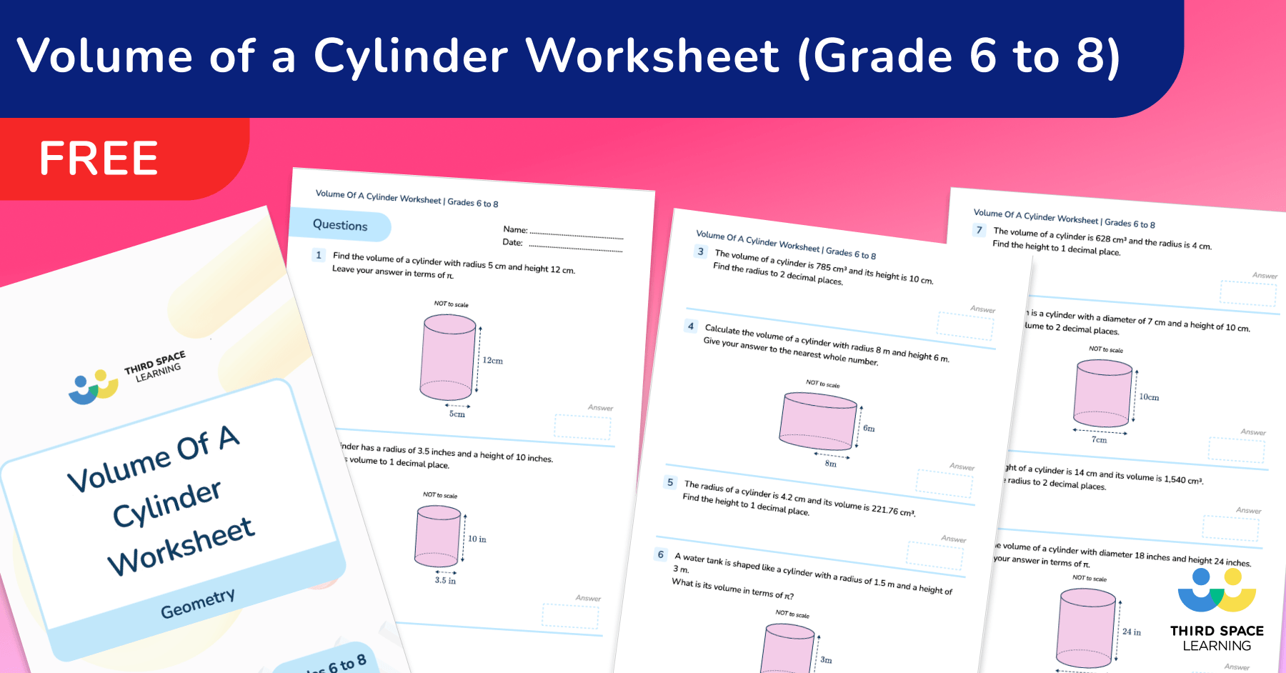 Free Volume Of A Cylinder worksheet for 7th Grade with 20 skills based practice questions.