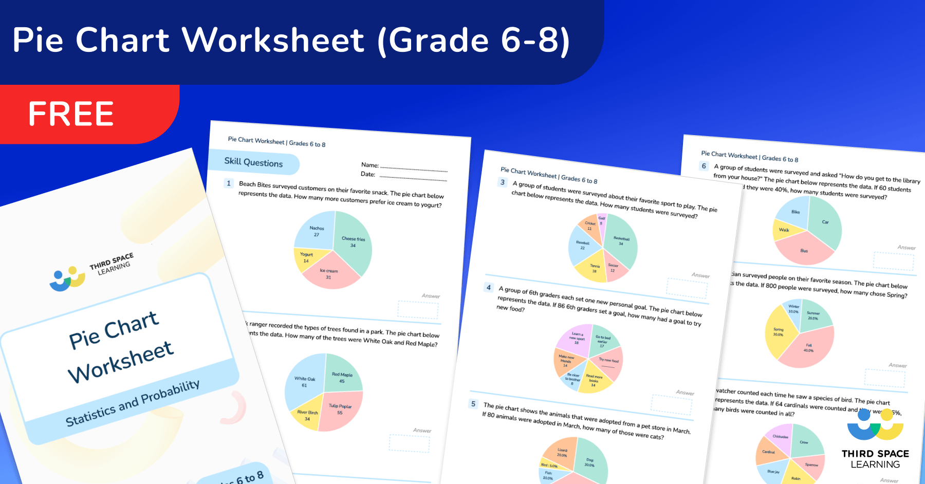 Free Pie Chart worksheet for 6th to 7th Grade with 10 skills based practice questions and 5 applied questions.