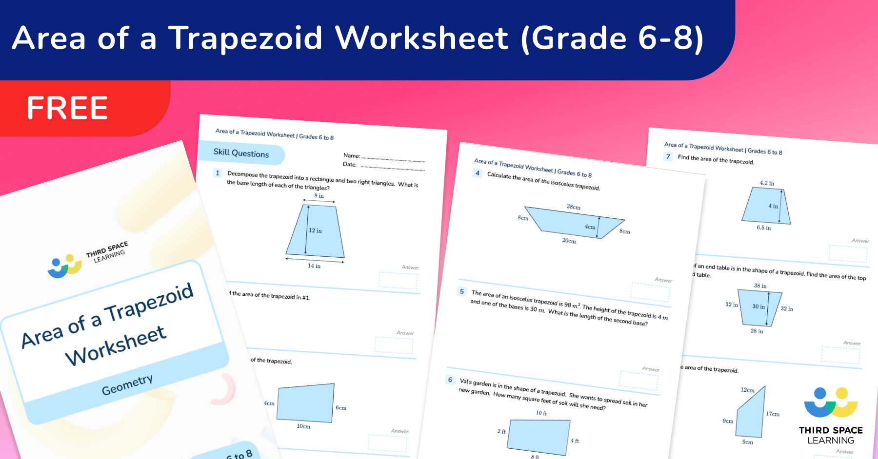 Free Area Of A Trapezoid worksheet for 6th Grade with 10 skills based practice questions and 5 applied questions.