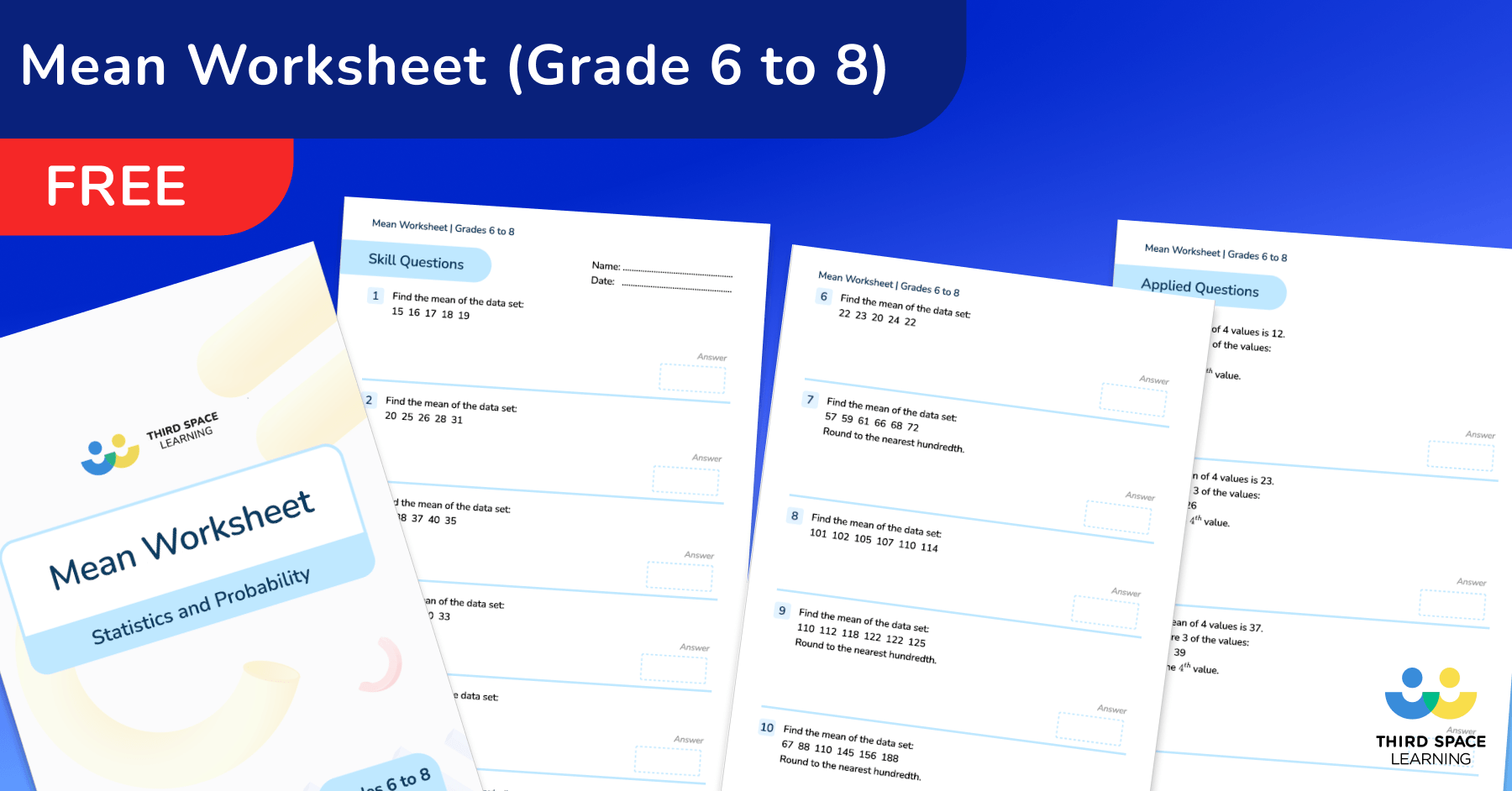 Free Mean worksheet for 6th Grade with 10 skills based practice questions and 5 applied questions.
